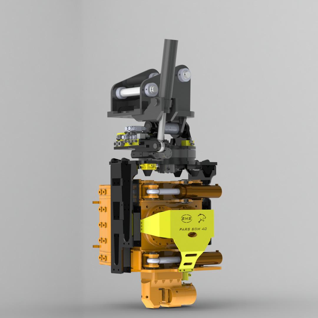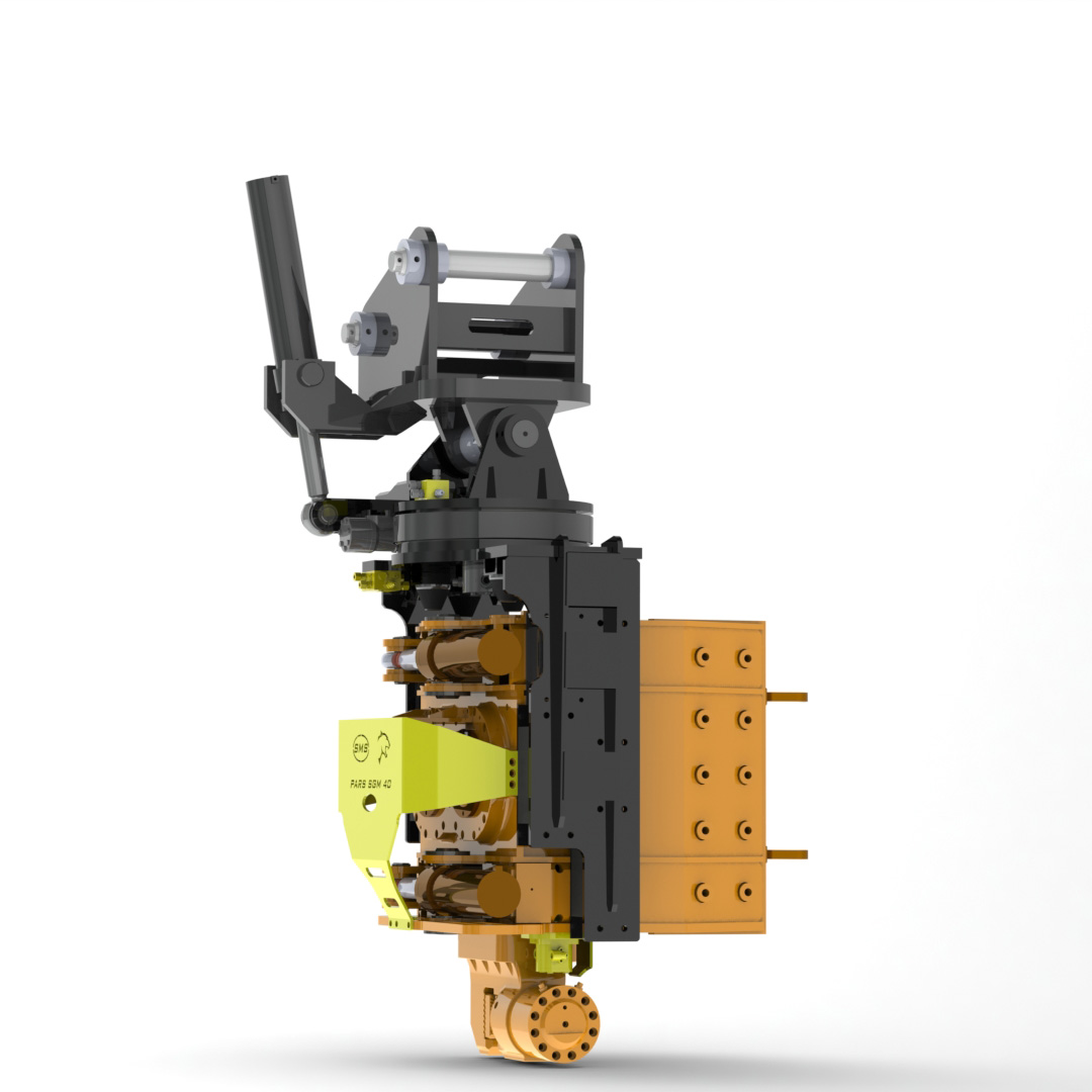 It is an easily mounted vibratory driver with side grip designed for 18 - 28 ton excavators. SGMK series vibratory hammers are designed as modular, allows driving up to max 30° inclination or flat, materials such as pipes, sheet pile H type, etc. The PARS SGMK series side grıip vibratory hammer unit attaches to the end of the bucket arm of an excavator. The vibration unit can be rotated vertically and horizontally.